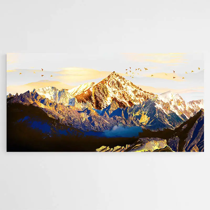 Ce tableau d'une Montagne Moderne représente un paysage montagneux enneigé hors du commun. Cette chaine de montagnes tout en longueur et éclairée par les rayons dorés du soleil est d'une beauté exceptionnelle et sera idéale pour compléter votre décoration scandinave.