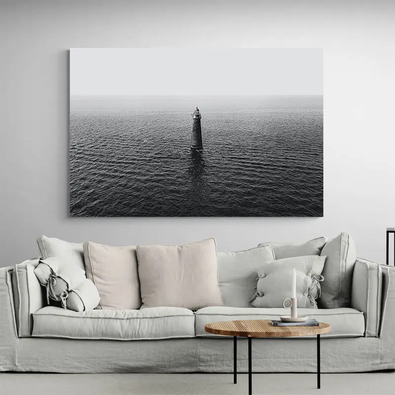 Il y a des tableaux comme ça, qui ne crient pas, mais qui parlent fort. Ce Tableau Phare en Mer, il fait exactement ça. Une scène toute simple : un phare, une mer calme, et ce noir et blanc qui rend l'ensemble presque intemporel.