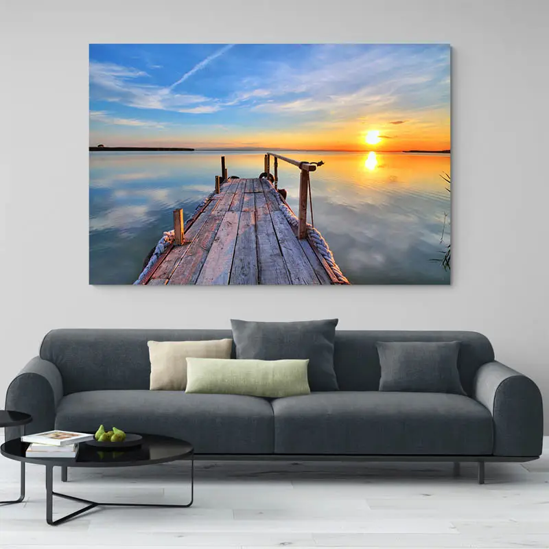 Tous les passionnés de coucher de soleil aimeront ce tableau d'un Ponton à coup sûr. Ce tableau scandinave Le Ponton est absolument à prendre en grand format pour l'exposer dans un salon ou dans une chambre. Les amoureux de la nature ainsi que les passionnés de photographie apprécieront les nuances bleues et orangées de la Golden Hour. Ce tableau peut très bien s'associer avec le tableau Montagne Moderne.