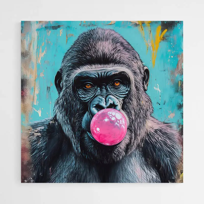 Ce qu'on aime, c'est ce contraste entre son allure imposante et ce chewing-gum complètement décalé. Ça marche à fond ! Le fond gris profond fait ressortir le rose éclatant, et le regard du singe, à la fois malicieux et presque complice, ajoute ce petit truc en plus. Dans un salon, une chambre d'ado ou même une entrée, il ne passe jamais inaperçu.