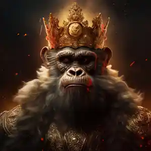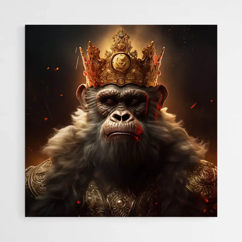 Ce qu'on aime ici, c'est le contraste entre le côté sauvage du singe et le côté royal de la couronne. Ça marche super bien. Et puis les couleurs chaudes derrière, entre l'or, le rouge profond et l'orange brûlé, ça donne une ambiance un peu théâtrale, un peu magique aussi.