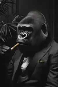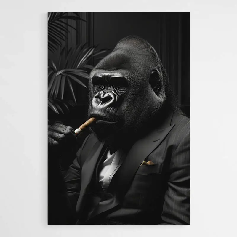 Ce tableau n'est pas simplement une œuvre d'art, c'est un avatar de personnalité, idéal pour ceux qui possèdent un esprit aussi indomptable que leur style. Le noir profond du costume et le regard intense du gorille, capturés dans ce portrait saisissant, sont autant d'invitations à embrasser sa propre force et individualité.