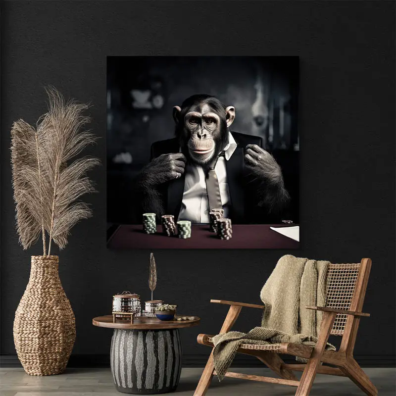 Ce tableau de singe poker et Les singe en général sont très tendance dans la décoration murale. Cela se justifie incontestablement par notre envie d'exotisme. Les bêtes exotiques spécifiquement les animaux de la forêt trouvent leurs places dans nos décorations d'intérieur depuis déjà des années en amenant de la couleur et de la vie à nos domiciles pour le plus grand plaisir de nos yeux. Peu importe leurs apparences ou leurs expressions, les œuvres de primates apportent souvent une touche d'humour et de gaieté à nos murs.