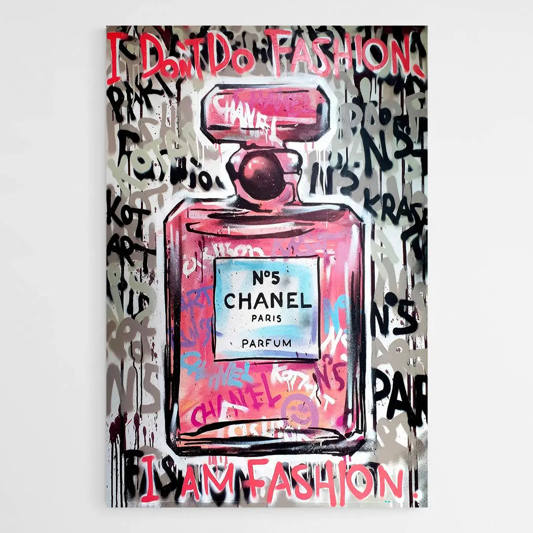 Le célèbre flacon du Chanel N°5 prend une toute nouvelle dimension dans ce tableau Chanel street art haut en couleur. Loin des vitrines feutrées, il s’affiche ici dans un univers rebelle, saturé de graffitis, de mots-clés mode et d'énergie créative brute. Le résultat ? Une œuvre à la croisée du luxe et de la rue, aussi percutante que stylée.