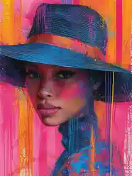 Ce tableau femme à chapeau, il a un truc en plus. Peut-être que c'est son regard, à moitié caché. Ou ce chapeau bleu qui fait toute la silhouette. En tout cas, ce qu'on remarque tout de suite, ce sont les couleurs : rose, orange, bleu... ça vibre, ça claque, mais sans jamais être trop. C'est vivant, élégant, un peu mystérieux aussi.