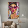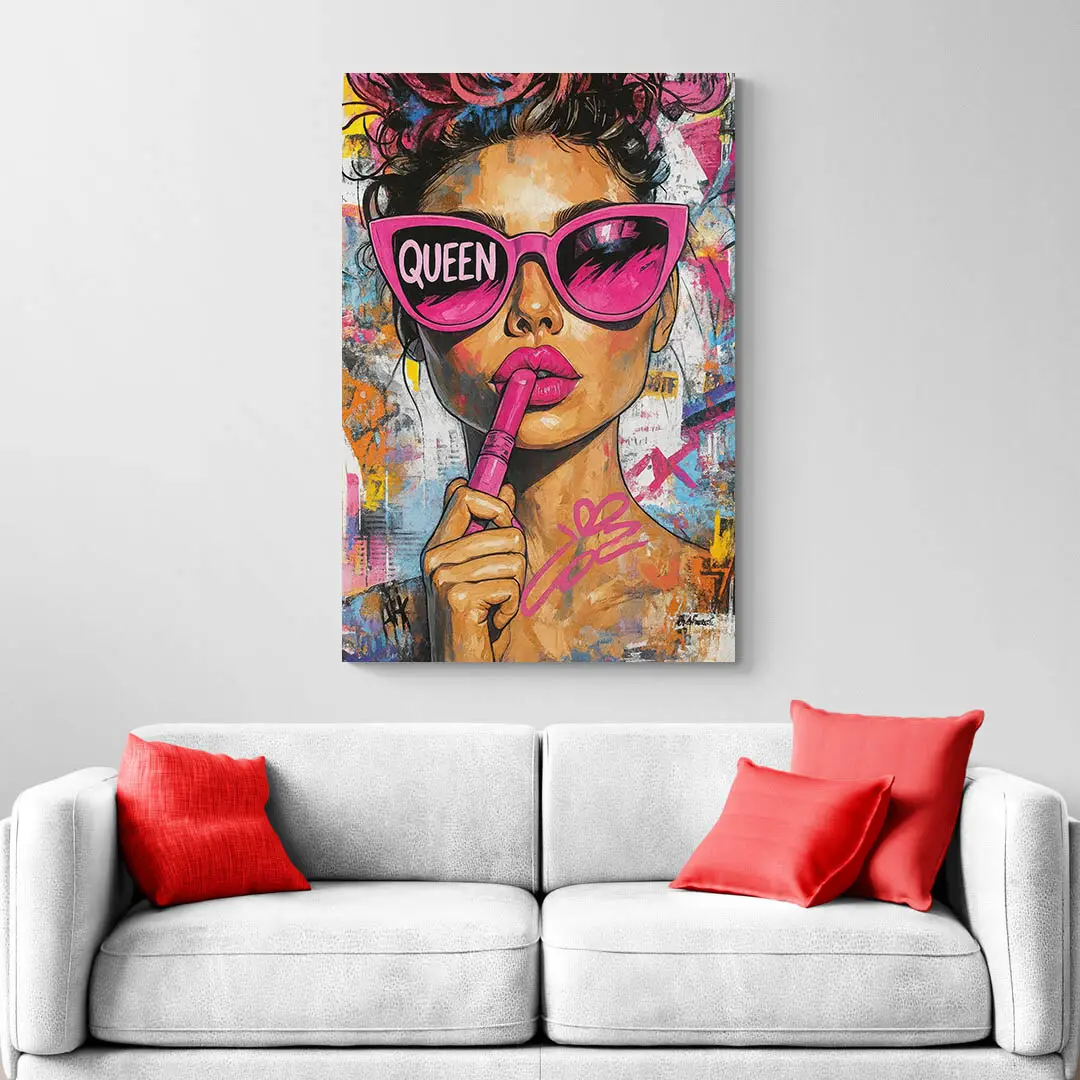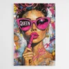 Ce Tableau Femme Street Art a du caractère, c’est le moins qu’on puisse dire. Une femme aux lunettes roses XXL, le mot “QUEEN” en plein centre, et ce rouge à lèvres qu’elle applique avec confiance. Tout est dit. C’est un cri de liberté, de style, de puissance. On ne le regarde pas, on le ressent.