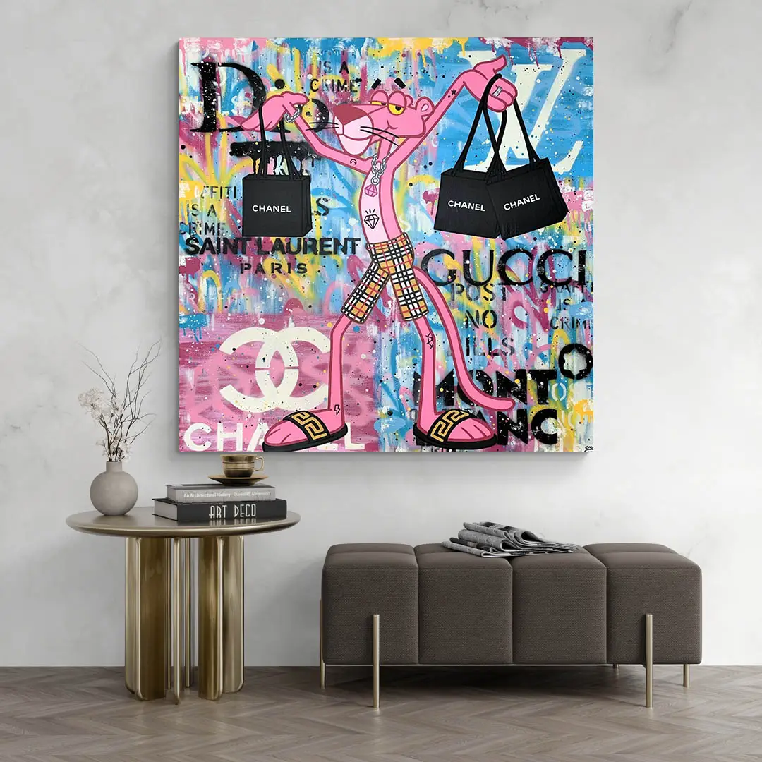 Ce tableau Panthère rose luxe détourne les codes du luxe avec humour. Il se moque gentiment de l’obsession pour les marques, tout en les mettant en scène de façon ultra esthétique. Le résultat est vibrant, vivant, et franchement, il donne le sourire.