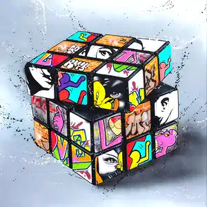 Ce tableau Rubik's Cube n’est pas qu’un simple clin d'œil à un jouet culte. C’est une vraie œuvre d’art qui joue avec les codes du street art et de la culture pop. Chaque face du cube semble racontée comme une petite scène : des personnages iconiques, des graphismes colorés, des symboles, des yeux, du mouvement… un vrai patchwork visuel qui attire l’œil et réveille l’espace.