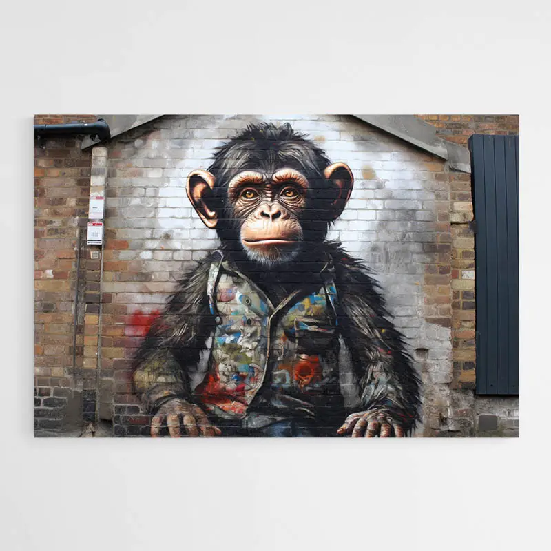 Ce qu'on adore, c'est le contraste entre le côté très urbain du mur, brut, texturé, presque new-yorkais, et la douceur du regard du singe. Il y a quelque chose de tendre mais aussi d'un peu impertinent. Sa posture, ses vêtements, tout ça ajoute une dimension inattendue, presque humaine. On ne sait pas si on doit rire, s'attendrir... ou les deux.