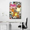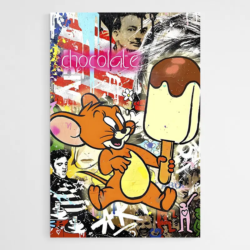 Pourquoi ici : la toile adoucit la densité du fond street art tout en conservant la vivacité des couleurs de Jerry et de la glace chocolat. Elle donne un rendu proche d’une fresque urbaine.