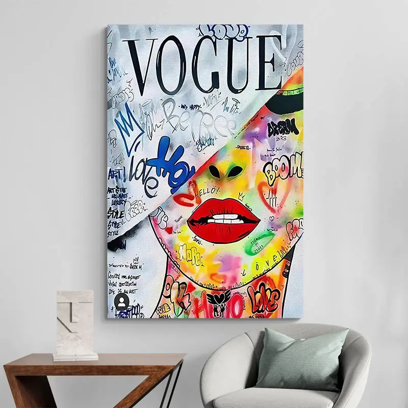 Ce tableau street art luxe est tout sauf discret. Il détourne l’univers raffiné des couvertures de magazines de mode pour le faire exploser dans un feu d’artifice de couleurs, de tags, de graffitis et de symboles pop. On y retrouve le mot "VOGUE", une bouche rouge éclatante, des cœurs, des logos, des textures... et surtout, une attitude.