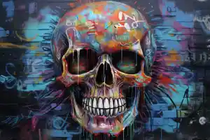 Ce tableau street art, on ne peut pas passer à côté. Ce crâne multicolore posé sur un mur de briques noir, c'est le genre de visuel qui en impose direct. Les couleurs sont vives, presque fluo, et pourtant tout est super détaillé. C'est pas juste une explosion de peinture, c'est une vraie composition réfléchie, avec une ambiance entre chaos et maîtrise.