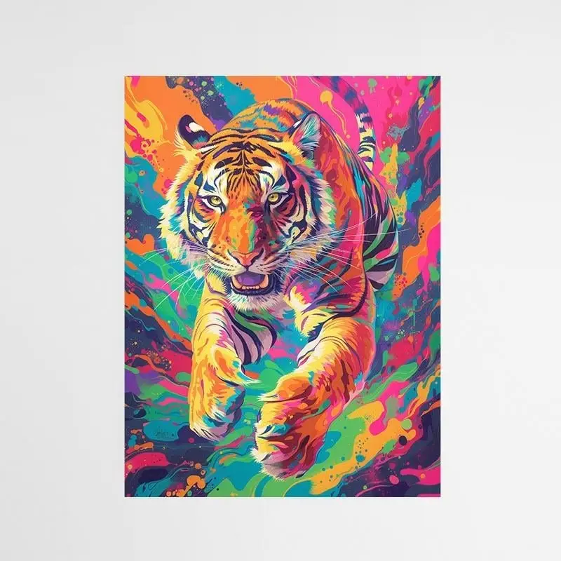 Ce tableau tigre multicolore est un vrai feu d'artifice visuel. Le tigre, puissant et déterminé, est recouvert de teintes éclatantes : jaune, rose, bleu, vert... On dirait presque une explosion de peinture en plein mouvement. Et pourtant, tout reste parfaitement maîtrisé. Le regard est là, intense, comme figé dans l'instant. C'est sauvage, mais c'est aussi très artistique.