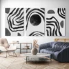 Ce tableau triptyque design n’a pas besoin de couleur pour marquer les esprits. Il joue uniquement avec les formes et les contrastes. Les lignes épaisses, presque mouvantes, semblent encercler le cercle central comme un point d’obsession. Il y a une vraie tension visuelle, mais contrôlée. C’est un tableau qui impose une présence.