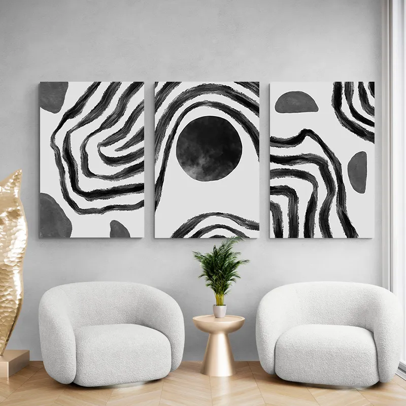 Ce tableau triptyque design n’a pas besoin de couleur pour marquer les esprits. Il joue uniquement avec les formes et les contrastes. Les lignes épaisses, presque mouvantes, semblent encercler le cercle central comme un point d’obsession. Il y a une vraie tension visuelle, mais contrôlée. C’est un tableau qui impose une présence.