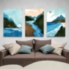 Ce qu’on apprécie, c’est la dominante de bleus nuancés, contrebalancée par des verts sombres, des touches brunes et un ciel clair. Ce jeu de couleurs donne de la profondeur et apporte une fraîcheur visuelle, sans jamais être froide. Le tableau triptyque paysage s’adapte aussi bien à une pièce lumineuse qu’à un intérieur plus cocon.