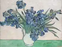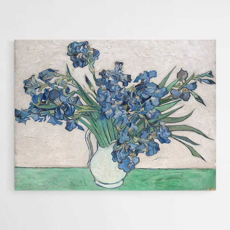 En mai 1890, juste avant de quitter l'hôpital psychiatrique de Saint-Rémy, Van Gogh dépeint quatre bouquets luxuriants de fleurs, les uniques natures mortes qu'il ait réalisées pendant son passage d'un an à l'asile : deux de la fameuse fleur violette ainsi que deux de roses. Toutes dans des teintes et des dispositions contraster. Dans ce tableau d'Iris de Van Gogh, le peintre a voulu une peinture harmonieuse et douce en disposant les boutons violets sur un fond rose pâle. Une autre œuvre de cette série, « Rose ' est disponible sur Tableaux du Monde. Tous deux appartenaient à la maman de Vincent.