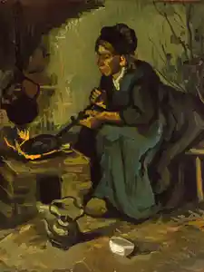Cette toile La Cuisine Paysanne par une Cheminée de Van Gogh a été peinte en 1885. Peu de temps après que le peintre néerlandais ait réalisé la célèbre toile des mangeurs de pomme de terre. Les deux toiles sont dans des teintes sombres qui rappelaient à l'artiste le savon vert ou une pomme de terre fraichement sortie du sol. Van Gogh appréciait vraiment peindre les paysans sans adoucir leurs traits en gardant un aspect authentique. Il disait que si une peinture paysanne sent le bacon, la fumée ou la vapeur de pomme de terre cela était très bien et rajoutait un aspect authentique à la toile, de même si une peinture d'écurie sent le fumier.
