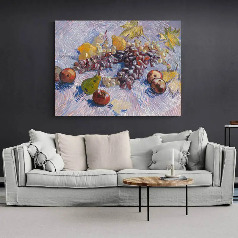 Ce tableau Raisins Citrons Poires et Pommes de Van Gogh fait partie d'un ensemble de peinture qui représente des fruits de saison que l'artiste a peints en 1887. Sur ces toiles, il a simplifié son éventail de teinte. En effet, il a utilisé des tons plus vifs et utilisé une peinture plus épaissie qu'auparavant. Sur cette toile, l'utilisation de couleurs complémentaires, jaune et violet, bleues et orange et rouges et vertes au service de l'intensité chromatique. La conséquence de ces contrastes de teintes est renforcée par le motif pulsé des coups de pinceau qui établit la nappe et constitue un champ de force autour du fruit. La toile faisait sans doute partie des « natures mortes violentes '.