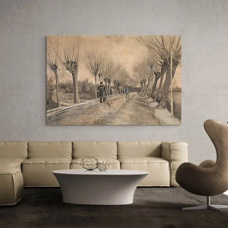Ce tableau Route à Etten de Van Gogh a été réalisé en 1881, lorsque le peintre néerlandais résidait à Etten. Durant cette courte période, il fera un certain nombre de dessins d'agriculteurs et d'ouvriers régionaux réalisant des travaux routiniers et modestes. Cette composition remarquable, où l'on voit un individu avec un balai dans une avenue entourée de saules têtards, est un aperçu typique de ses autres dessins de la même époque. Vous pourrez également trouver d'autres dessins de Van Gogh dans la collection consacrée à l'artiste sur Tableaux du Monde.