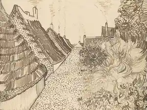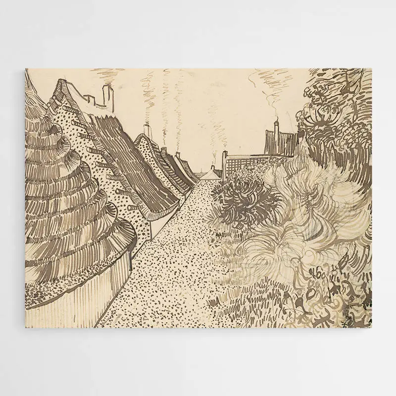 Cette esquisse de Saintes Maries de la Mer de Van Gogh a été réalisée en 1888 alors qu'il séjournait à Arles. Il a donc fait un voyage dans le petit bourg de pêcheurs méditerranéen des Saintes Maries de la Mer, où il effectue une vue peinte de cette ruelle aux toitures de chaume. Ce croquis demeurait l'un des quinze qui ont été transmis à l'ami du peintre néerlandais, l'artiste Émile Bernard. Pour son ami informé de son activité. Dans ces dessins poignants, Van Gogh a harponné la quintessence des peintures tout en établissant de nouvelles compositions.