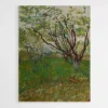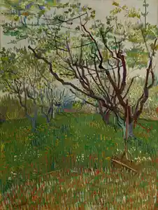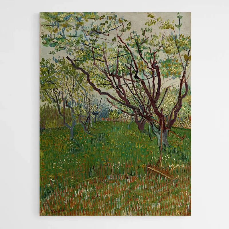 Cette toile Verger en Fleur de Van Gogh a été peinte au printemps 1888 pendant une période où le peintre travaillait énormément. En effet, entre le mois de mars et celui d'avril, le peintre néerlandais a consacré quatorze peintures à ce fameux verger. Œuvrant dans un éventail de couleur, de formats et de genres différents. Cette toile est caractérisée par les branches anguleuses et allongées des arbres en fleur. Cela manifeste l'admiration de l'artiste pour les estampes nippones. Son introduction des outils de jardinage au premier plan en fait l'un des deux seuls tableaux de verger à faire un sous-entendu à une présence paysanne.