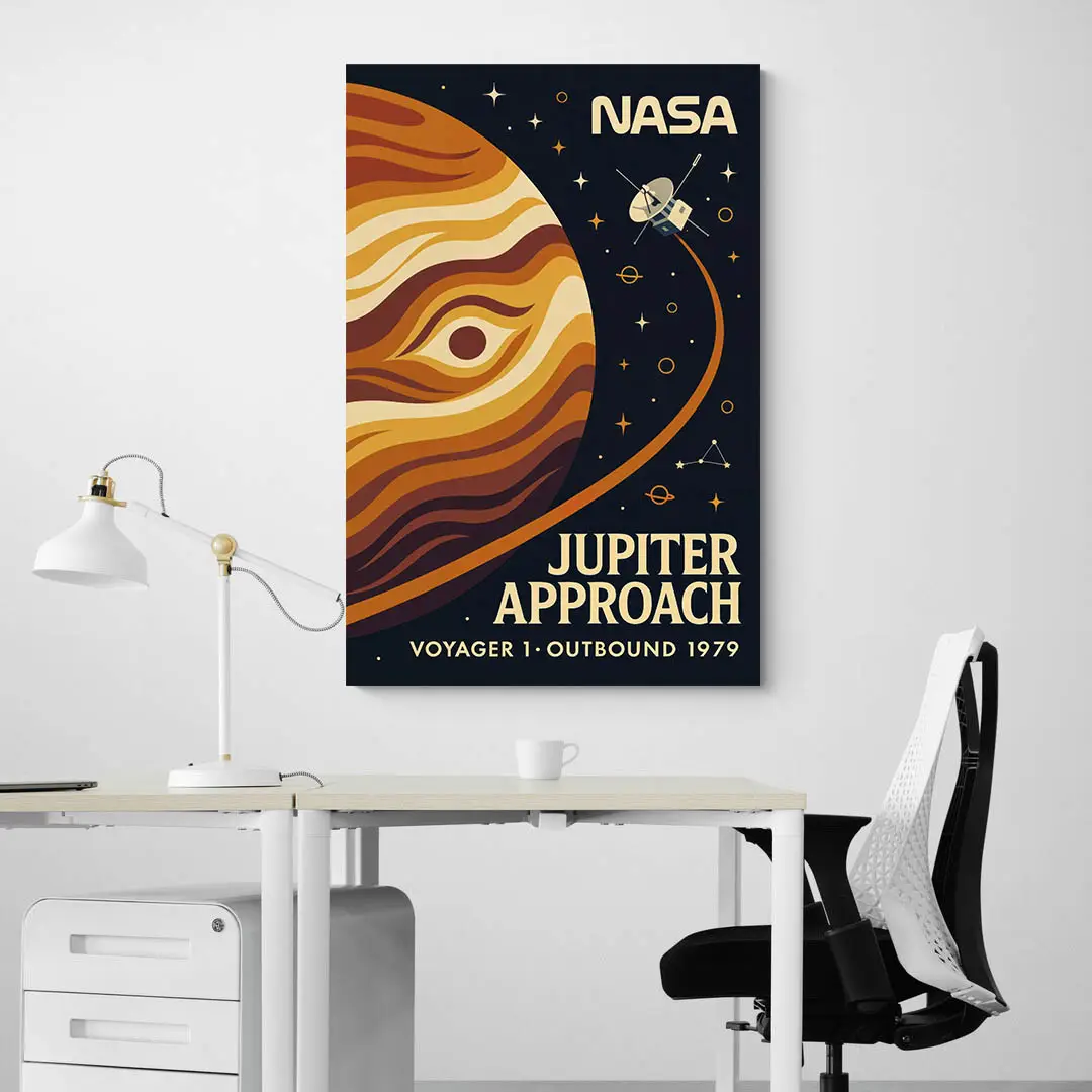 L’affiche rend hommage à la mission Voyager 1, lancée en 1977, avec le moment clé : l’approche de Jupiter en 1979. Pour les amateurs d’astronomie comme pour ceux qui ont grandi en rêvant des grandes expéditions cosmiques, cette affiche de la NASA a quelque chose de profondément inspirant. Elle parle de dépassement, de curiosité, de grandeur.
