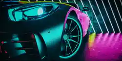 Les couleurs néon, mêlant des teintes de bleu, violet, et rose, apportent une dimension vibrante à l'ensemble, transformant une scène automobile classique en une véritable œuvre d'art urbain. Ce tableau évoque des sensations fortes, idéales pour les amateurs de sports mécaniques et de design avant-gardiste.